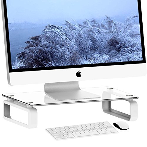 - Personality Design ☞ Our Design team spent a lot of time on this computer monitor stand riser design. The riser top is made of clear tempered glass with round polished edges, not only safe for human body but also looks elegant
