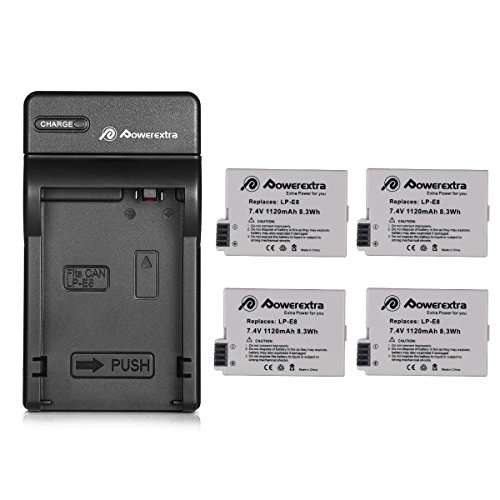 "Title: Powerextra 4 pack Replacement Canon LP-E8 Battery For Canon Rebel T5i T4i T3i T2i DSLR Digital Camera With Charger for Canon LP-E8 Replacement of LC-E8E