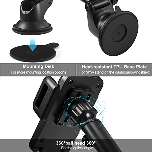 - OPTIONAL AND EASY INSTALLATION. Either stick to your dashboards and windshield with powerful suction pad or the provided mounting disk. It will get stuck firmly and keep your cellphone in place without worrying road vibrations. One touch locking feature allows you to release/lock your device quickly and securely with single hand.