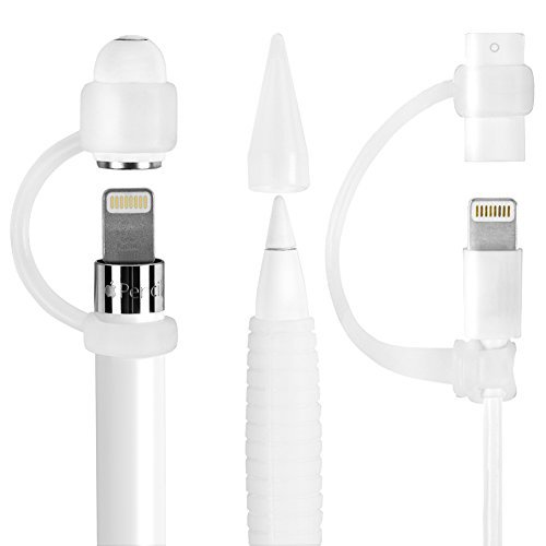 - POWERFUL FUNCTION: The Cap Holder prevents pencil cap from being lost; The Nib Cover protects Pencil Nib from damage; The Lighting Cable Adapter Tether secures apple lightning to Micro USB Adapter and protects lightning charging from being lost; The fiber cap as a stylus for all touchscreen devices is a replacement cap for Apple Pencil; The Soft Silicone Grip hugs your pencil tightly to prevent relative sliding