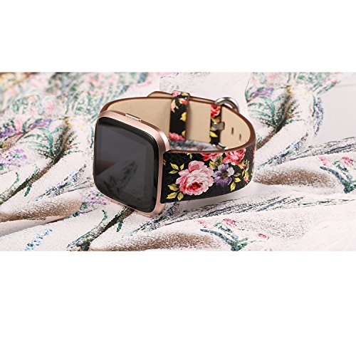 "Title: bayite leather bands for Fitbit Versa, Slim Genuine Leather Strap Replacement Accessories Fitness Classic Wristband for Versa Bands Women Men, Black with Pink Flower