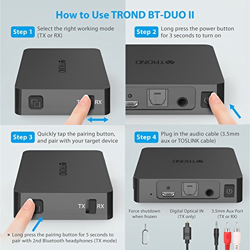 - 2-IN-1 DESIGN. Powered by the premium CSR8670 chipset, TROND BT-DUO II could be switched easily between the transmitter (TX) mode and the receiver (RX) mode. You can pair the transmitter with your wireless headphones and watch TV shows late at night. Or you can use it as a Bluetooth receiver, and enjoy CD-quality music wirelessly from your phone to your wired home stereo system