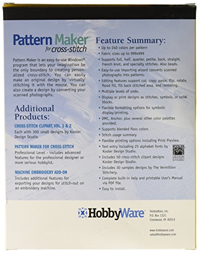 Hobbyware-Pattern Maker Software: Standard Version. An Easy-To-Use Windows Program That Lets Your Imagination Be The Only Boundary To Creating Personalized Cross Stitch. Easily Make An Original Design By 'Stitching' It With The Mouse Or Turn A Digital Photo Into A Design! This Software Features Up To 240 Colors Per Pattern, Fabric Sizes Up To 999X999, A Variety Of Knots And Stitches, And So Much More! This Package Contains One Software C.D. And One Instructional Booklet. Minimum System Requirements: Windows 95, 98, Me, 2000, Or Xp, 16-Bit Color Resolution, 64Mb Of Ram, And 20Mb Of Hard Disk Space. Made In Usa.
