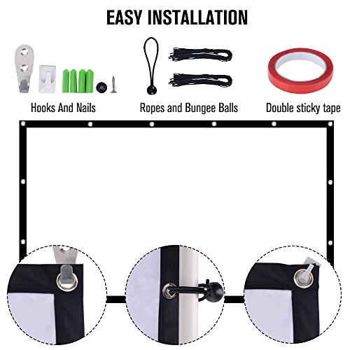 - EASY INSTALLATION: Each projector screen comes with many installation accessories, like hooks, nails, ropes and double sticky tape to make sure a easy set-up on home or usual wall and outside yard, traveling. 2 different hooks give you 2 choices, sticky or with the nails. Also can be used for rear projecting